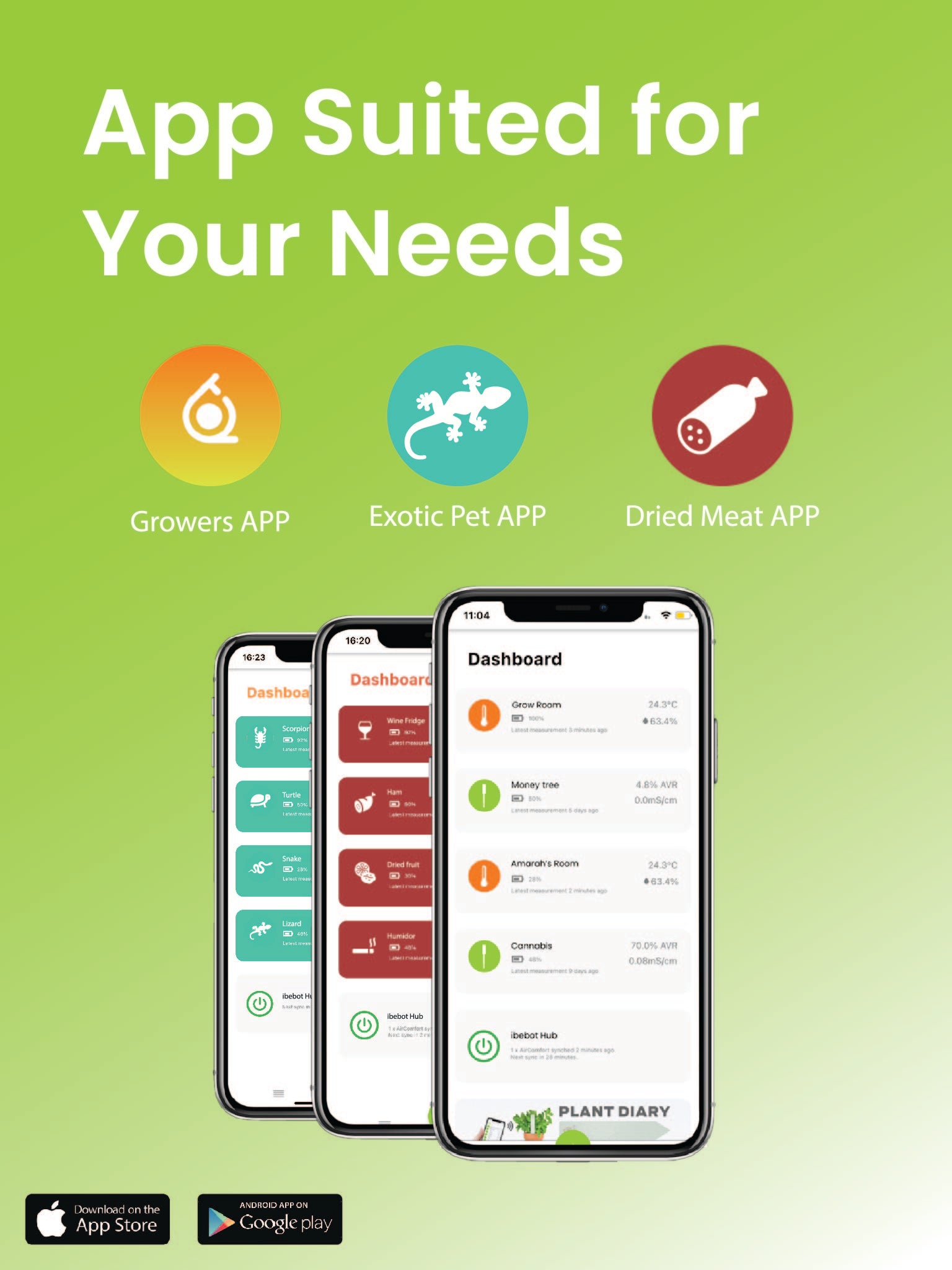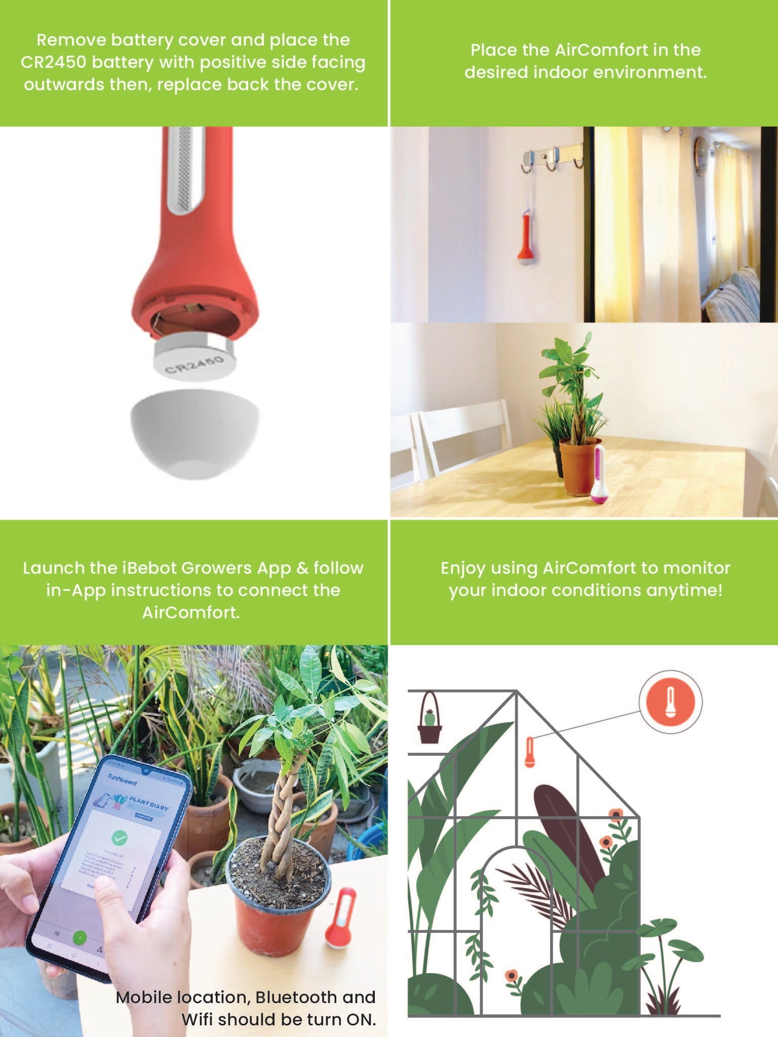 - Wireless Connectivity: Connect the AirComfort to ibebot Growers App via Bluetooth to access accurate sensor data readings. Maintain a 10 meters connectivity distance from the AirComfort. Remember to keep the mobile Bluetooth, internet connectivity and location ON to sync the data completely.